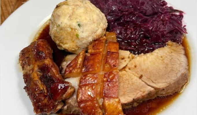 Zutaten: 1,5 kg Schweineschulter oder Schweinebraten 2 Zwiebeln 3 Knoblauchzehen Salz und Pfeffer nach Geschmack 2 EL Senf 2 EL Öl 2 EL Kümmel 2 Lorbeerblätter