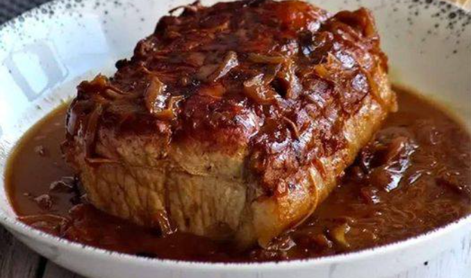 Zutaten: 1 kg Schweinebraten (aus der Schulter oder dem Nacken) 2 große Zwiebeln, in Ringe geschnitten 3 EL Honig 2 EL Senf 2 EL Olivenöl oder Pflanzenöl