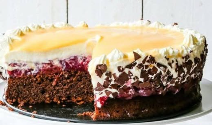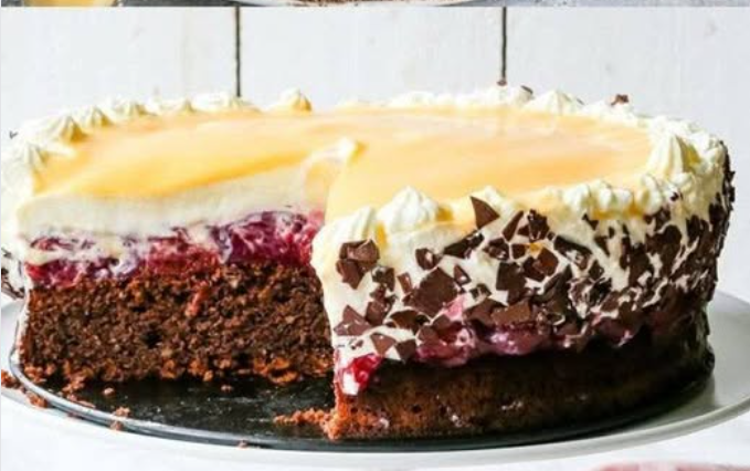 Sie war nicht übertrieben dekoriert, nicht mit komplizierten Mustern oder bunten Glasuren versehen. Aber sie sah einfach perfekt aus. Ein dunkler, saftiger Nussboden, darauf eine fruchtige Kirschschicht, darüber eine luftige Sahnehaube und ganz oben diese glänzende Eierlikörcreme, die wie ein goldener Spiegel wirkte.