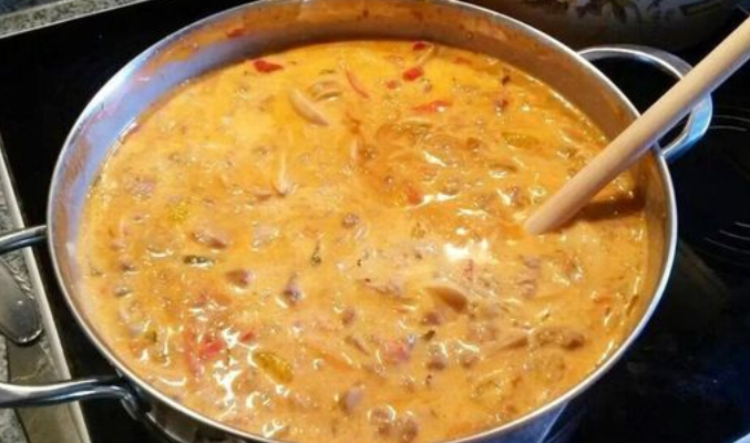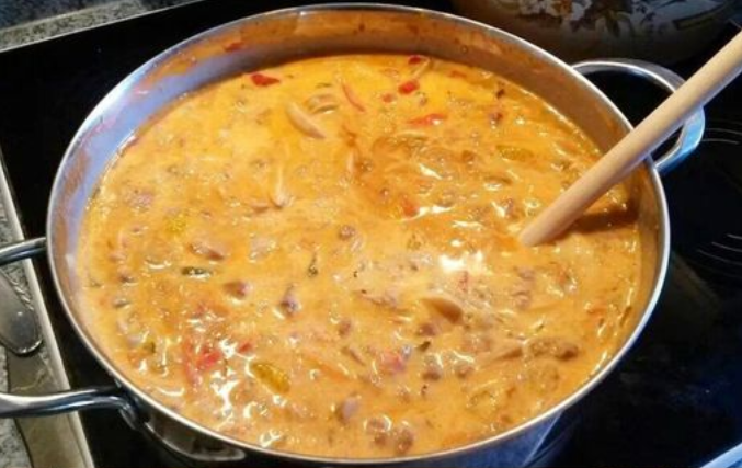 Zum Schluss Kräuterfrischkäse, Sahne und Kräuter unterrühren. Den Partytopf noch etwas durchziehen lassen.