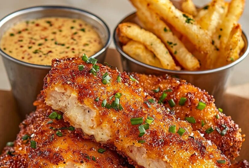 - Servieren: Die goldbraun gebackenen Hähnchenstreifen aus dem Ofen nehmen und mit dem Paprika-Dip servieren.