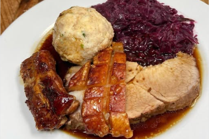 Traditionell wird Schweinebraten in Deutschland oft mit Knödeln oder Kartoffeln und Rotkohl serviert.
